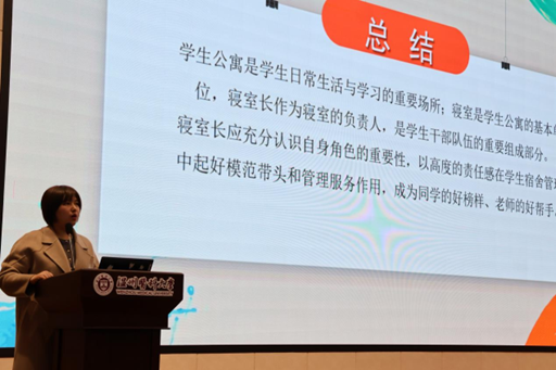 王茹新老师聚焦寝室长工作职责、文明建设与心理危机应对等关键领域进行全面讲解。首先,她提到寝室长作为学生干部的重要组成部分,肩负文化推广、安全卫生管理、心理健康反馈、信息上报等多重职责。 她提到文明寝室建设是寝室长的核心任务之一,寝室长需倡导社会主义核心价值观,营造温馨和谐的寝室文化,鼓励同学们积极参加这学期举办的“栖心计划 三阶美学”活动。作为心理辅导站站长,她向寝室长们分享了心理危机的类型,让寝室长们掌握倾听、支持与引导、寻求专业帮助等技巧,提醒他们遵循“不贴标签、注意保密、及时反馈”原则,呼吁大家共同守护心理健康。