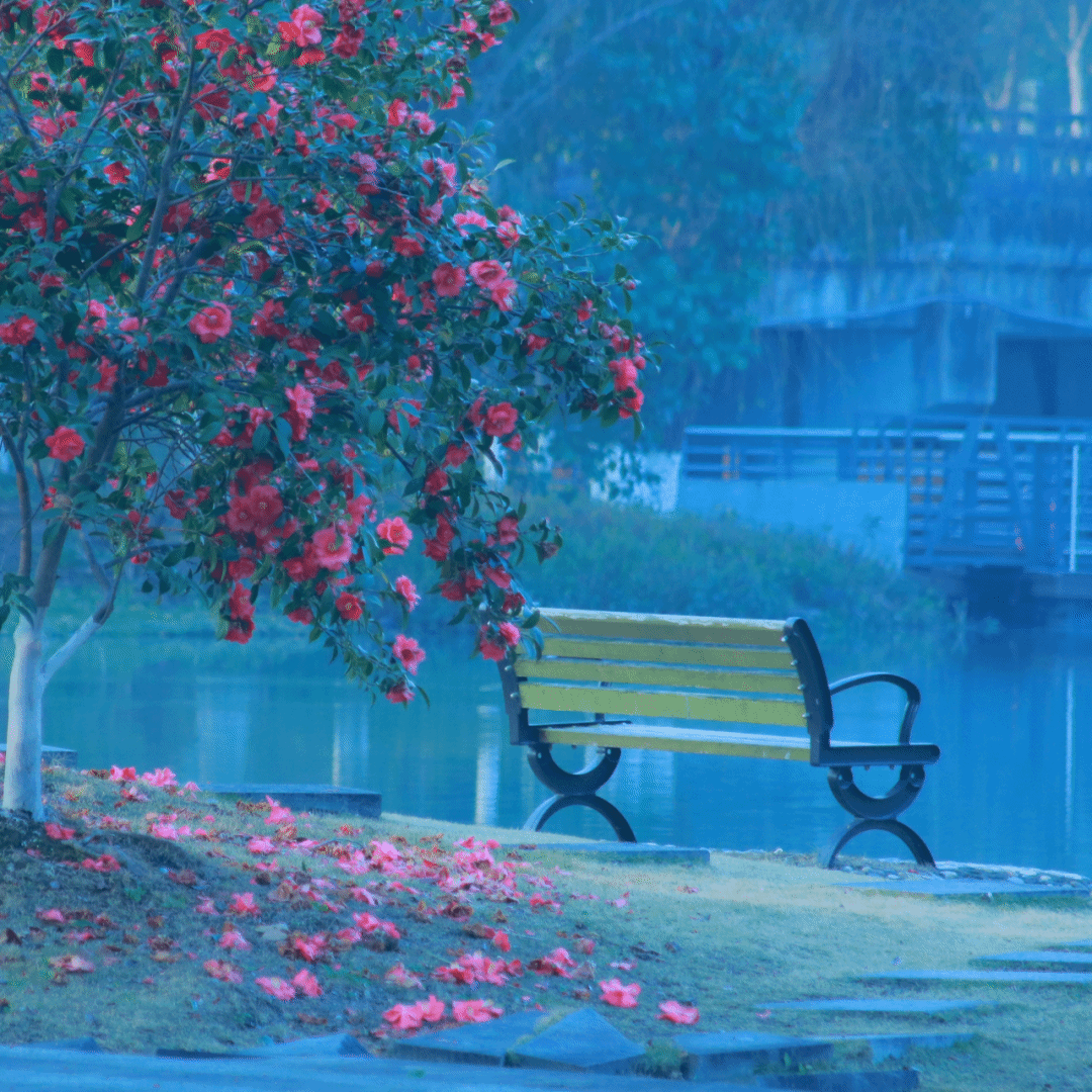 叶永茂 春天,是希望的季节,也是遗憾的季节。花开终会谢,人聚终会散。图中花朵的掉落与空无的长椅对应,代表着遗憾,尤其是在温暖的春天。偏蓝的色调更加强调冷清。