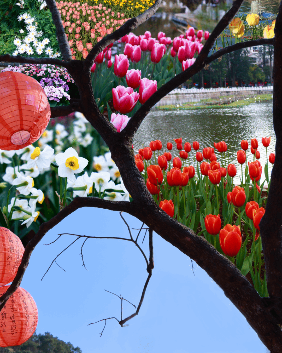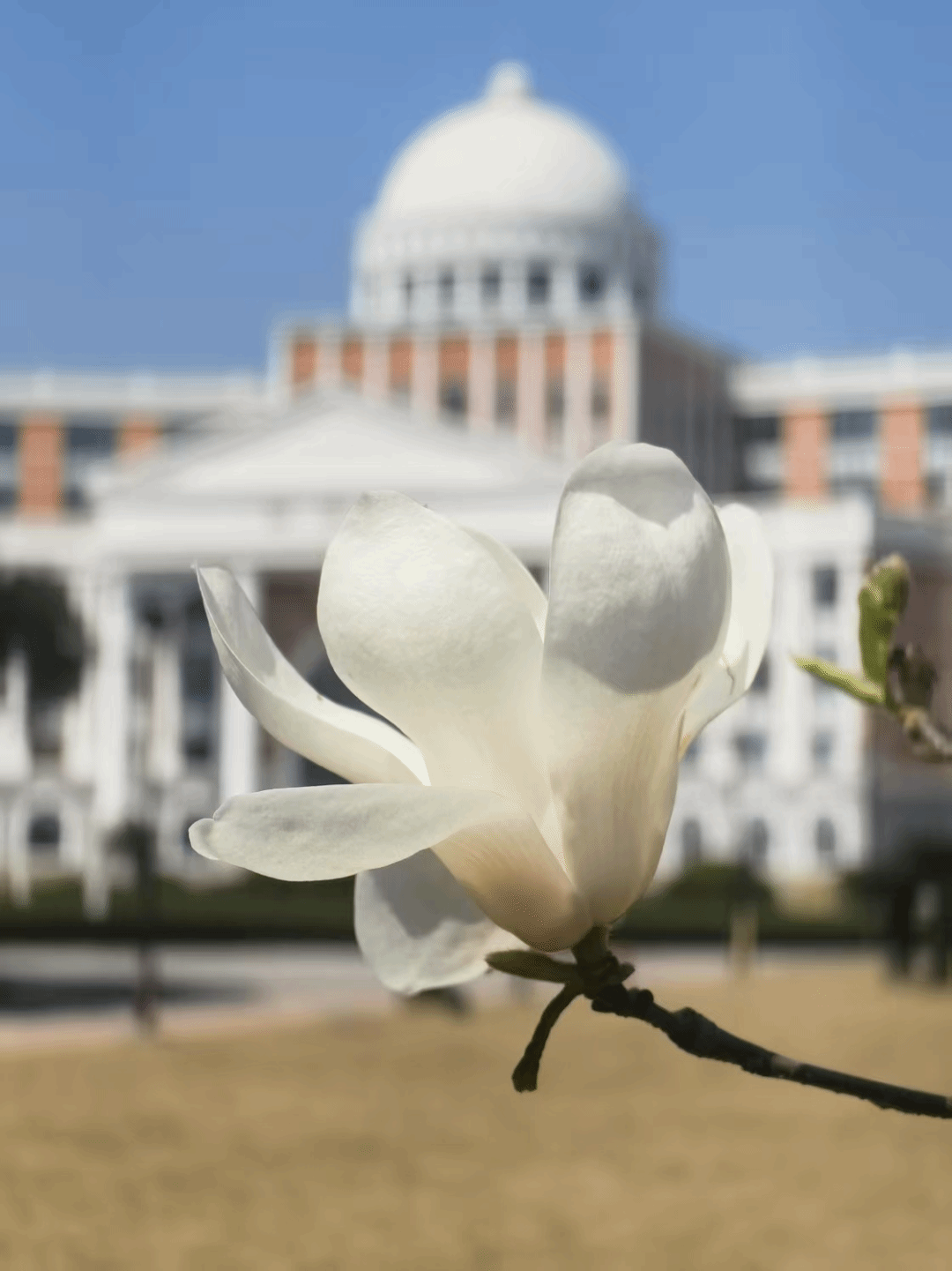 俞鸿丽 从图书馆出来后,一朵玉兰花忽然闯入视线。它在春日暖阳中舒展着洁白花瓣,身后是古朴的图书馆,书香与花香在那一刻奇妙交融。 e 周雅雯 翠湖的春天总爱藏在晨露里。我按下快门时,一簇簇郁金香正被薄雾染成白色,像盛满甜酒的琉璃杯。风一拨,花尖轻颤,将倒影揉碎融入湖面粼波中。