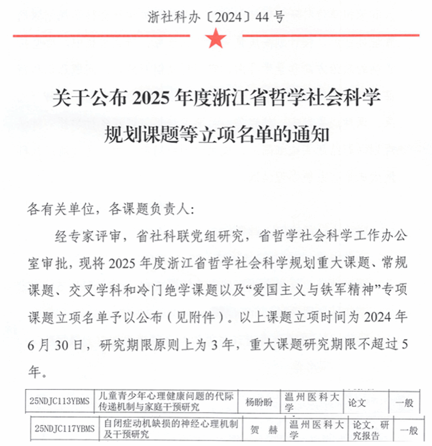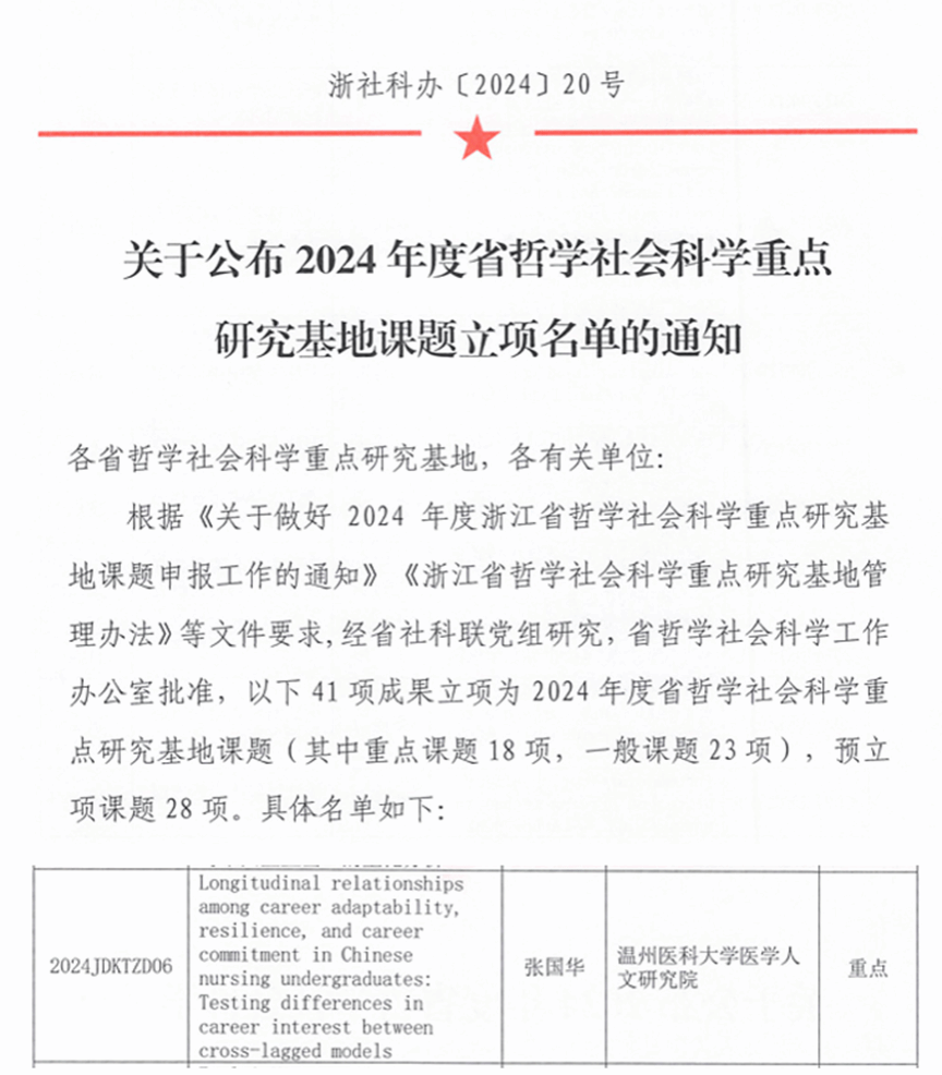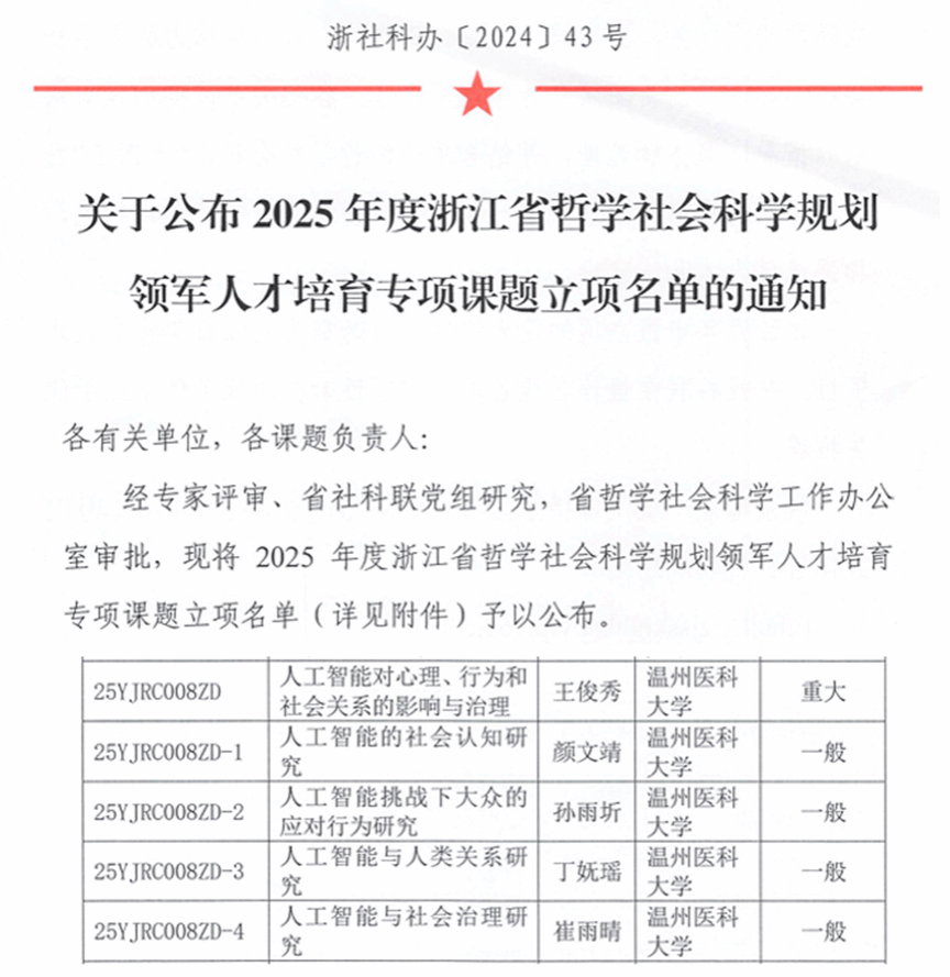 近日浙江省哲学社会科学工作办公室公布立项通知,我院王俊秀教授的“人工智能对心理、行为和社会关系的影响与治理”项目获2025年度浙江省哲学社会科学规划领军人才培育课题立项,这是我院首次获省哲学社会科学重大课题立项,同时其子课题4项立项为一般课题。王俊秀教授原任中国社会科学院社会学研究所社会心理学研究室主任、社会心理学研究中心主任、博士生导师,2023年全职引进我院,现为温州市哲学社会科学重点研究基地“温州市社会心理服务研究院”院长、中国社会心理学会侯任会长。 同期,张国华教授获2024年度省哲学社会科学重点课题(省重点研究基地课题)立项,学院教师另获省哲学社会科学规划2项一般课题和1项部门合作专项研究课题立项,学院2024年度省级哲学社会科学类立项课题质量和数量均创历年新高。