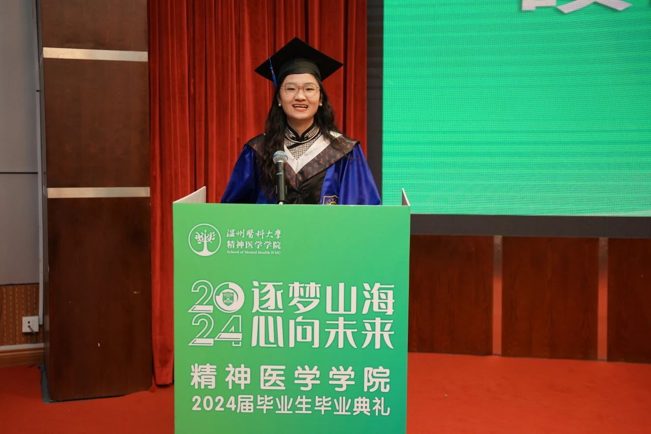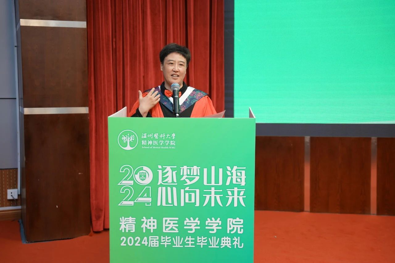 学院副院长吴伊丽为毕业生们致辞。她高度肯定全体毕业生在读书期间付出的努力和取得的成绩,并向毕业生们提出了三点期望:一、心怀仁爱,践行医者初心。希望同学们在未来的职业生涯中,始终牢记“健康所系,性命相托”的誓言,秉持医者仁心,用精湛的医术和温暖的关怀,为患者带去希望和光明。二、追求卓越,勇攀学术高峰。希望同学们能够保持对知识的渴望,积极进取,在科学研究中勇攀高峰。三、关注心灵,守护精神家园。希望同学们能够心怀社会责任感,积极投身到心理健康知识的普及和精神疾病的防治工作中,用专业知识守护人们的精神家园。