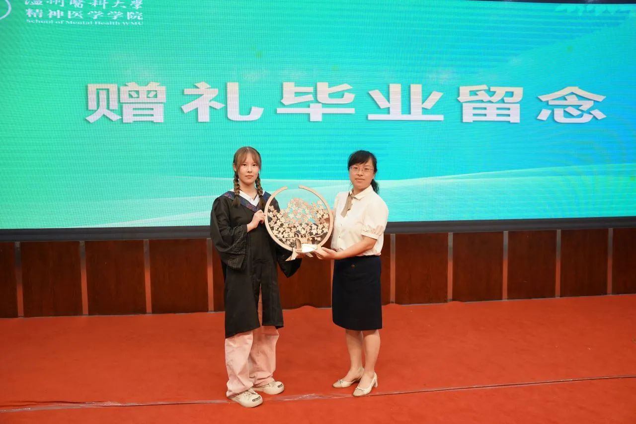 毕业典礼上,学院、医院与毕业生之间互赠了纪念品,以实物承载这份深厚的情谊和美好的祝愿。学院党委副书记涂艳玲接受了毕业生们为学院准备的礼物——祝福树,表达了毕业生们对学院的美好祝愿以及最深切的致敬。同学们也为医院准备了锦旗 ,“情系教育 惟宏隆德”八个大字是同学们对温州康宁医院多年来给予支持的感谢。温州康宁医院党委副书记徐谊为毕业生们赠送了纪念品--定制充电宝,希望同学们在失落时可以续航充电充满正能量。