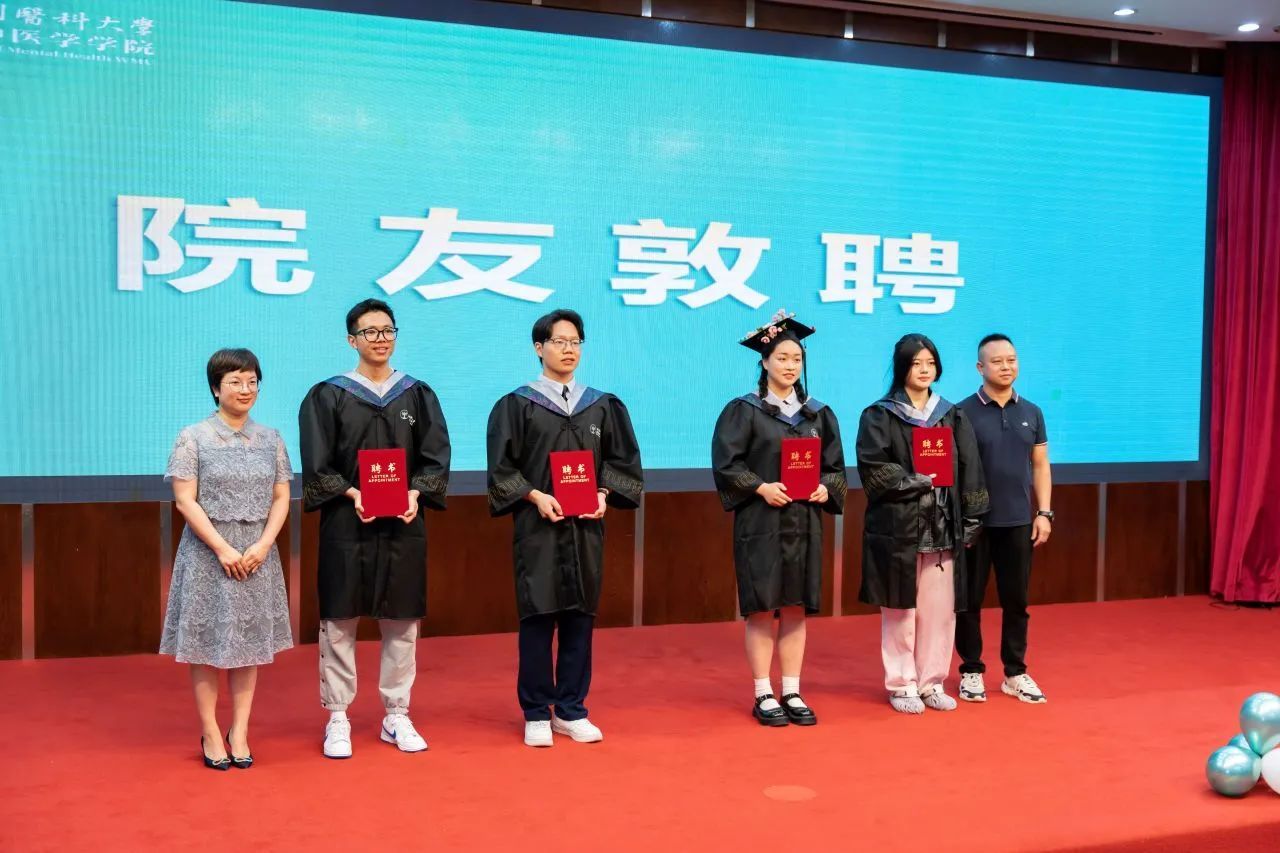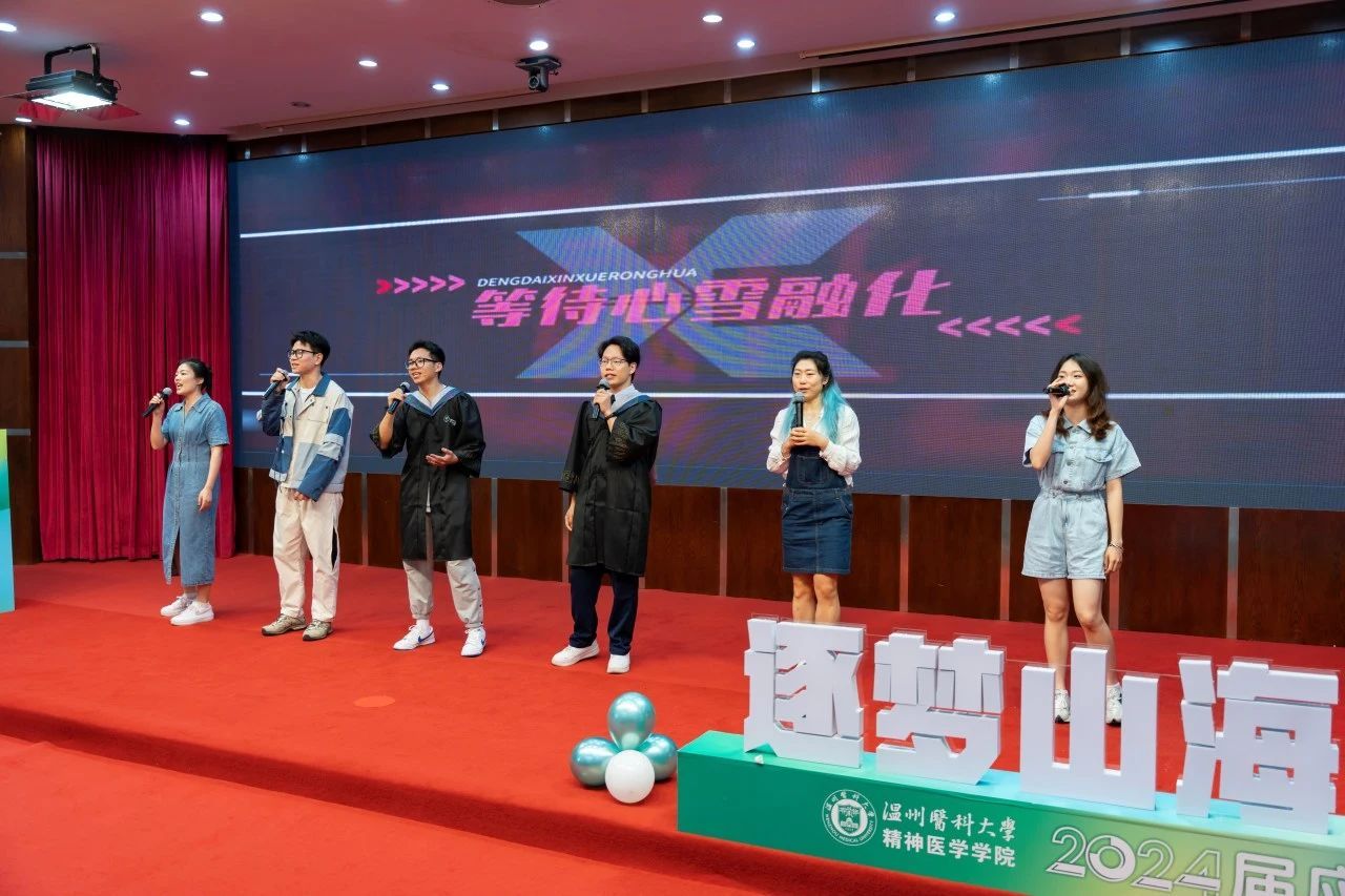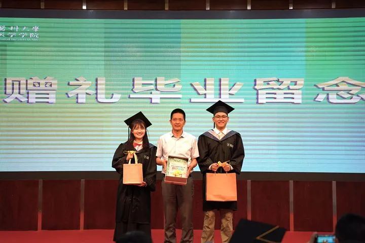 毕业典礼上,学院、医院与毕业生之间互赠了纪念品,以实物承载这份深厚的情谊和美好的祝愿。刘德辉老师、蒋柯老师接受了毕业生们为学院准备的礼物——牌匾,“精养繁华 心育高才”八个字是毕业生们对学院的由衷感谢,也是毕业生们对学院最深切的致敬。同学们也为医院准备了心理健康科普优秀作品,它凝聚着同学们在心理健康普及领域的智慧结晶,以及对未来医疗科普工作的美好憧憬。温州康宁医院副院长许宁为毕业生们赠送了纪念品--定制充电宝,希望同学们在失落时可以续航充电充满正能量。