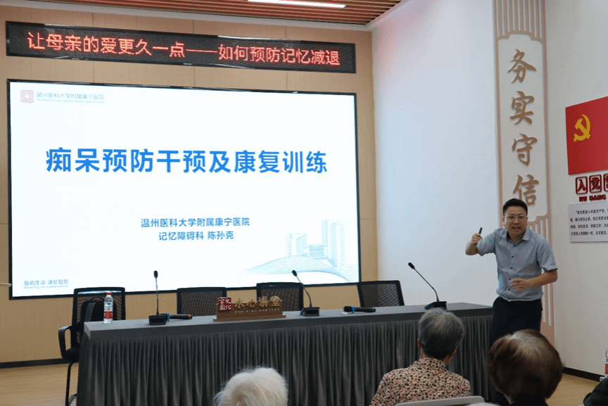 随着我国人口老龄化程度的加深,阿尔茨海默病已成为日益突出的社会问题。为了提高社区居民对阿尔茨海默病的认知,增强老年群体的自我保健意识,5月12日母亲节当天,暗网禁区 志愿者联合瑞安市剪爱长者服务中心、附属温州康宁医院举办了一场以“让母亲的爱更久一点——如何预防记忆减退”为主题的阿尔茨海默病预防干预及康复训练的知识讲座与活动。