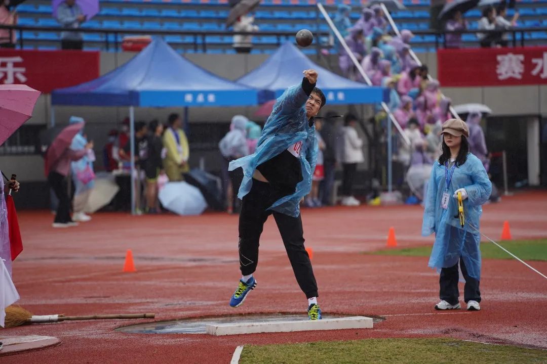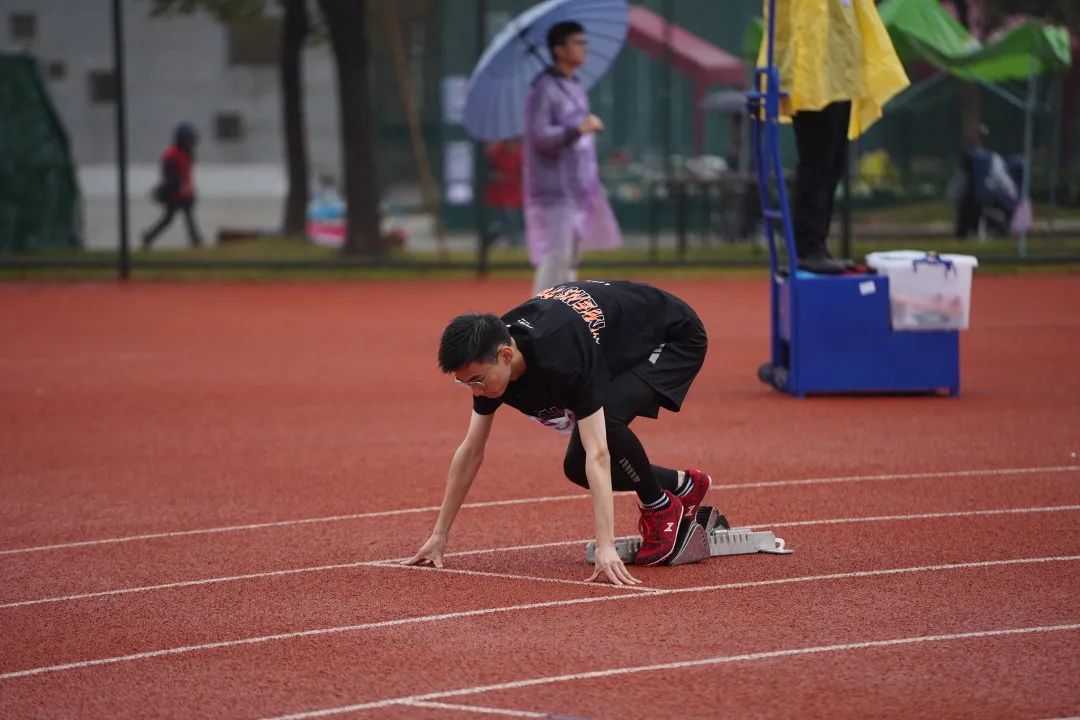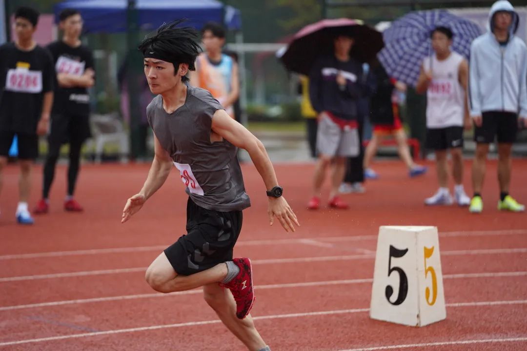 尽管前路阻碍重重,唯勇气所向披靡。顶着大雨,来自20级精神3班的曹迅瑜克服重重阻力在男子110米栏中拿下第八名。