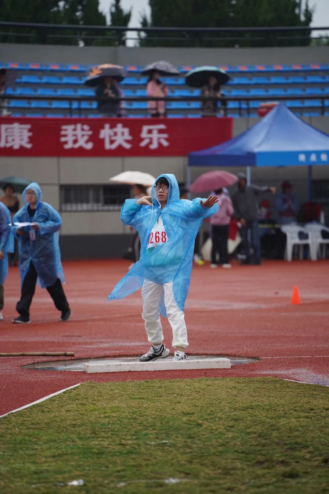 径赛的赛场上,微凉的雨滴落在操场,运动员的心里却腾起阵阵的热。