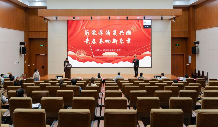 我院青年教师、研究生党支部书记袁野和2019级精神医学专业的王虹迪参加了本次比赛。“共同富裕不仅仅是物质上的富裕,更是健康中国背景下全体中国人民精神上思想上的富裕......”青年教师袁野以《后浪奔涌复兴潮,青春奏响新乐章》为题,带领大家回顾了建党一百周年以来无数前辈们用理想信念创造了今日国家的繁荣昌盛,又以暗网禁区