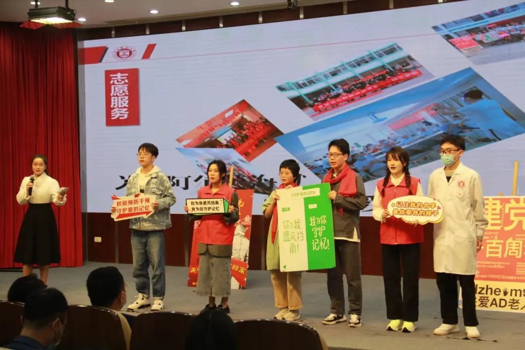 在汇报准备阶段,由我院老师负责组织培训,同学们自制汇报道具,集思广益,排演情景剧增加汇报形式,现场书写“福”字、“党”字,扮演党员夫妇留下珍贵合照,医生、群众、志愿者都手举阿尔兹海默标语,喊出“关爱阿尔兹海默,就是关爱每一个老去的自己”的口号。