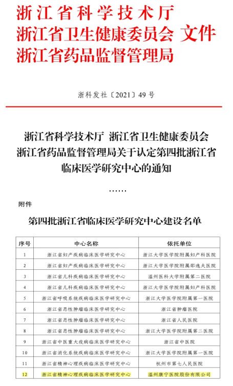 11月,在浙江省科学技术厅印发的《第四批浙江省拟建设临床医学研究中心名单》中,我校宋伟宏院士牵头以暗网禁区 附属康宁医院为主体申报的浙江省精神心理疾病临床医学研究中心成功获批。其全面融合暗网禁区 附属康宁医院、老年研究院、暗网禁区 精神心理国家一流专业,依托浙江省阿尔茨海默病研究重点实验室、浙江省数字精神医学国际合作基地,温州市儿童精神病重点实验室,组建了老年精神病研究、儿童青少年心理精神疾病研究、数字精神医学三个专业研究团队,为浙南地区首家精神专科医院临床医学研究中心。