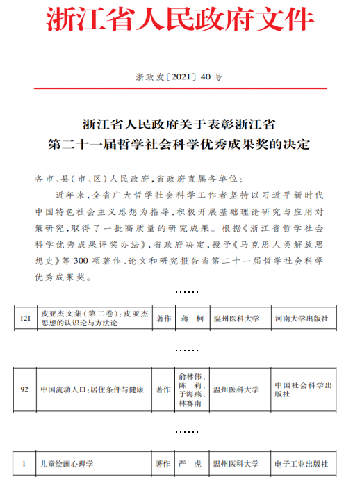 12月15日,浙江省人民政府发文公布第二十一届哲学社会科学优秀成果评审情况,我校共有4项成果获奖,我院占有3项。其中,我院蒋柯教授的专著《皮亚杰文集(第二卷):皮亚杰思想的认识论与方法论》、我院陈莉(第二)教授专著《中国流动人口:居住条件与健康》荣获基础理论研究优秀成果二等奖,我院严虎博士的专著《儿童绘画心理学》获应用对策研究与科普优秀成果青年奖。此外,在9月26日教育部发布的第六届全国教育科学研究优秀成果奖评选结果中,我院张国华(第二)副教授的专著《青少年与网络游戏:一种互联网心理学的视角》荣获二等奖。