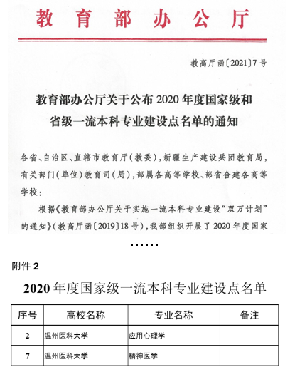 2月,教育部办公室厅公布了《2020年度国家级和省级一流本科专业建设点名单》,我院精神医学和应用心理学两个本科专业双双入选国家级一流本科专业建设点。