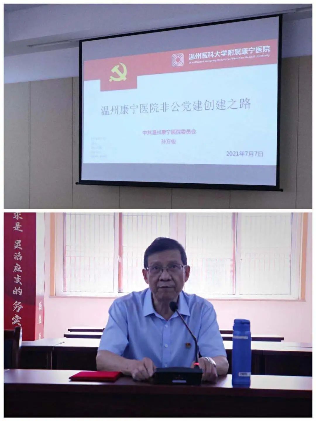 随后,温州康宁医院党委书记孙方俊为交流团全体党员讲授“温州康宁医院非公党建创建之路”专题党课。孙书记从理论引领与现实实践这两个维度讲述了温州康宁医院在创建非公党建这条路所做出的创新与探索,着重解读了疫情期间温州康宁医院党委是如何引领党员同志发挥模范带头作用,为社会、为人民的疫情防控工作。他强调在未来的日子里,温州康宁医院党委将加大与学院党委的联结、交流与合作,共同续写党建工作的新辉煌。