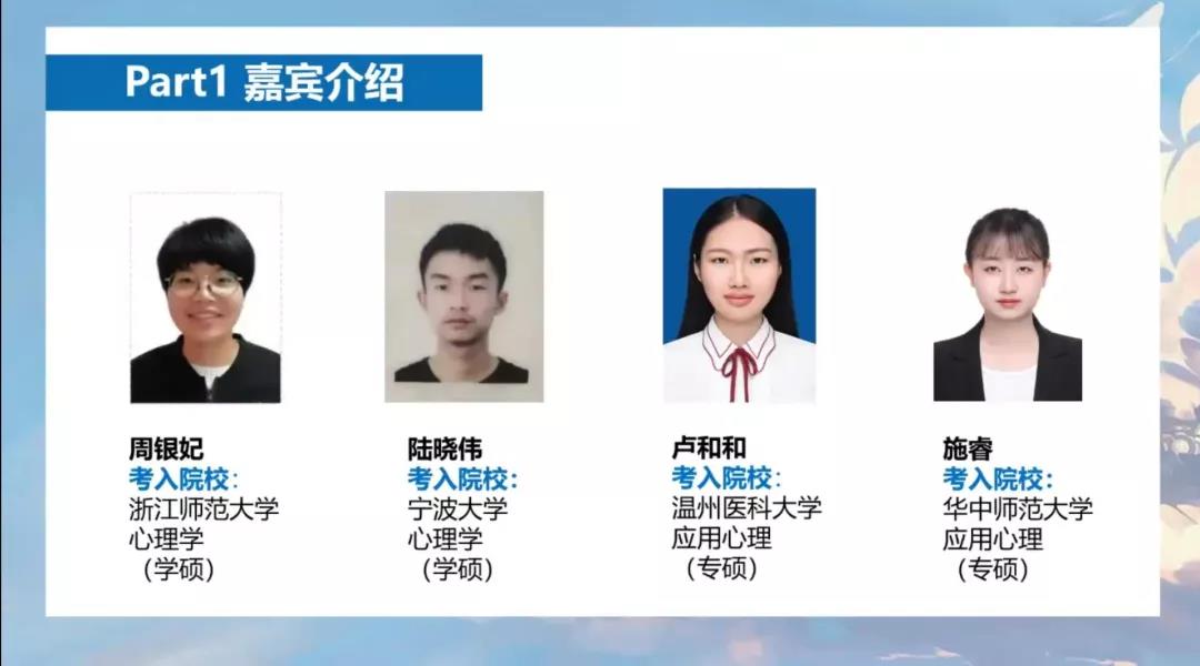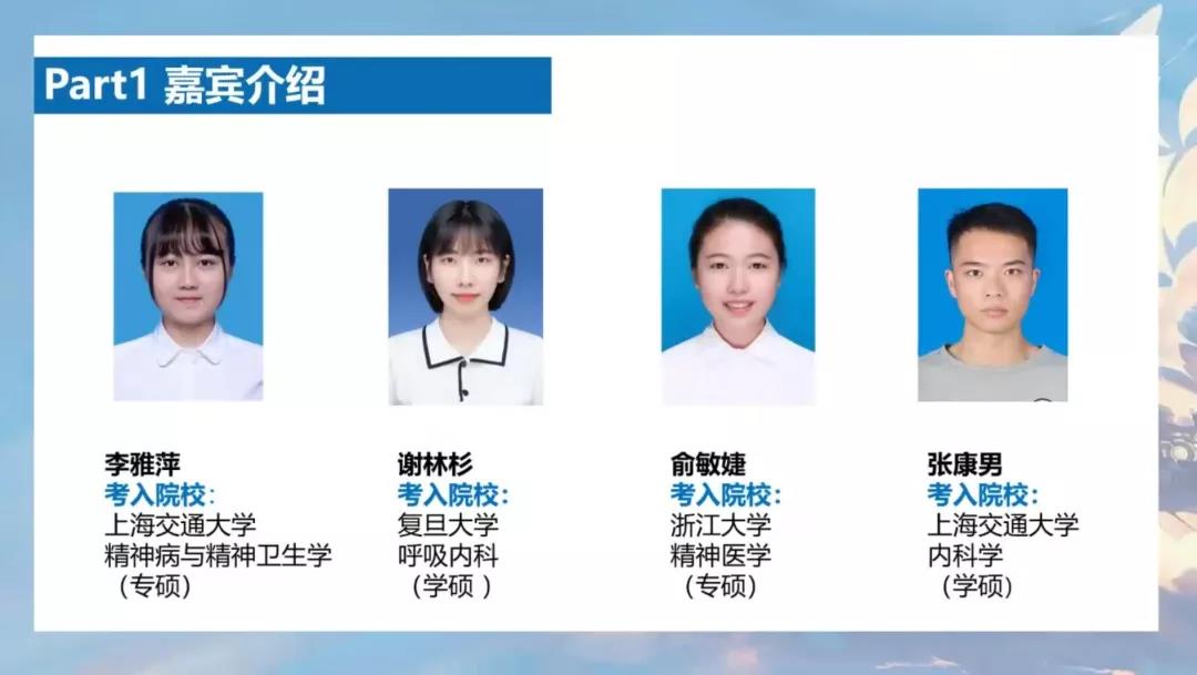 线上考研经验分享会采取现场直播的方式进行。此次的直播分享会邀请了来自暗网禁区 其他医学专业的毕业生浙江大学医学院附属二医院骨科胡邵隽、浙江大学医学院附属二医院神经内科陈罗薇、复旦大学眼科沈燕、上海交通大学医学院附属精神卫生中心吴观福、上海交通大学附属仁济医院心外科王恒、中国医科大学妇产科王雯可等为大家分享考研相关建议。