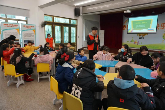 早上抵达七都儿童之家以后,志愿者们先与小朋友们做了热身游戏,随后开展主题班会,用通俗易懂的故事形式向小朋友们解释多动症的具体表现等基础知识,并以知识竞赛的方式加深小朋友们对知识的印象。随后,志愿者指导小朋友们一同玩了“心有千千结”小游戏,小朋友们随机站立,双手随机与周围的朋友相握,形成错综复杂的手链,小朋友们需要共同协作将手链恢复成圆圈。在活动地点常常响起孩子们爽朗的笑声。