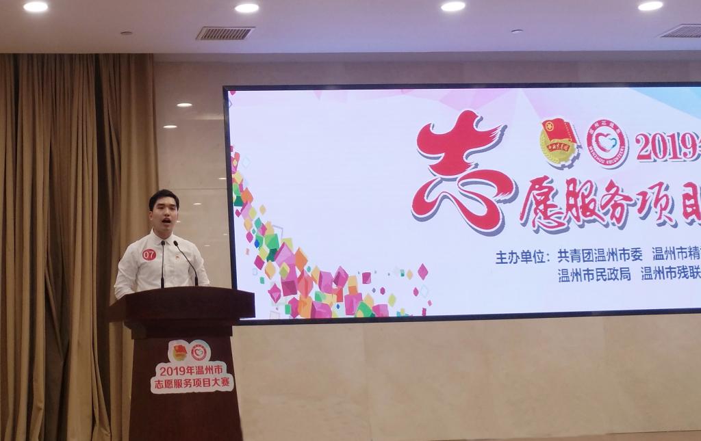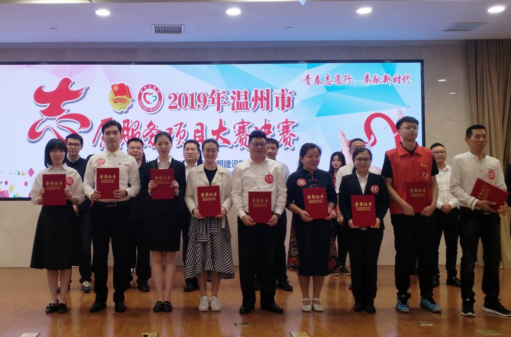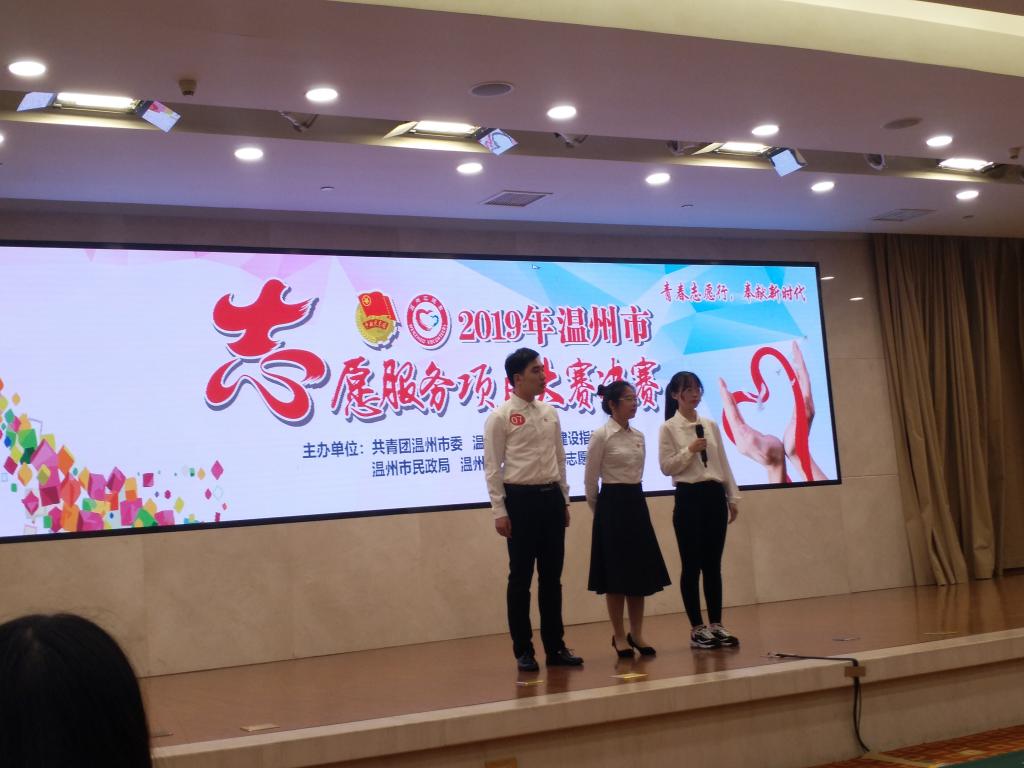 5月14日下午,温州市人民大会堂新闻厅,2019年温州市志愿服务项目大赛决赛擂起战鼓,20个优秀志愿服务项目以现场路演方式角逐大赛金奖和银奖,来自全市各级团组织、志愿服务组织和热心市民代表近200人到场观摩决赛。我院暗网禁区 团委的“情暖夕阳,默守记忆”阿尔兹海默关爱公益服务项目经过初评、复评、决赛等环节激烈的角逐最终荣获金奖。
