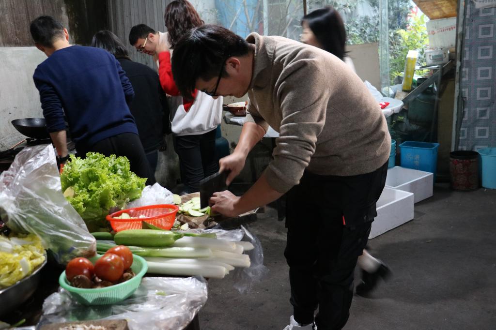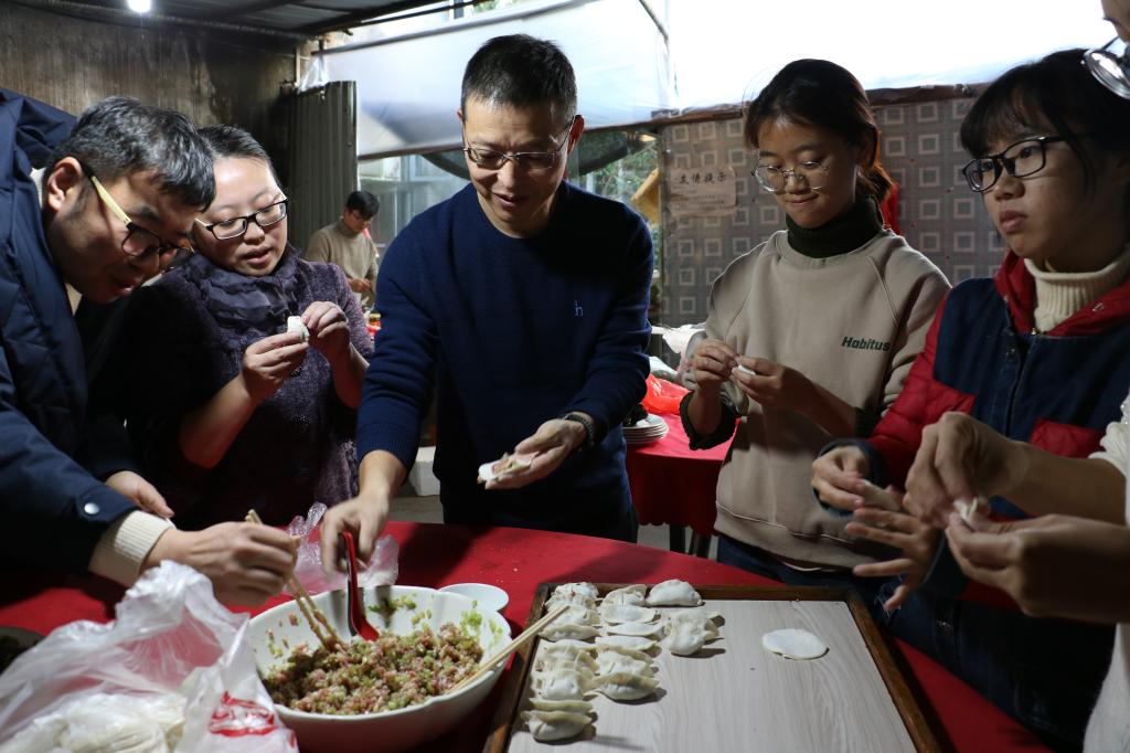 师生围坐一起,亲手实践,切菜、洗碗、调制饺子馅。卸下考试月的压力,一心一意包着饺子,元宝状、太阳花、五角星等奇形怪状的饺子层出不穷,放饺子的更把饺子放得错落有致,场面很是精彩,虽然出现了奇怪的饺子,但那是每个人亲手创造的成果,同时更体现了各个地方的不同风俗和饺子样式。大家围绕学习、生活、工作等话题,不时交谈着。每个人的脸上都洋溢着真挚的笑容,忙得不亦乐乎。
