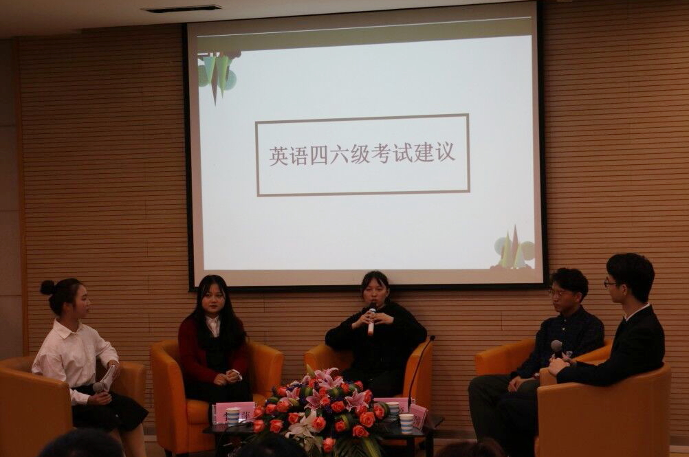 李雅萍学姐根据自己的学习经历对在座的各位同学进行了经验分享,她首先指出目前大部分学生普遍存在的心理—很多同学都想着裸考过四级。雅萍学姐首先否定了这种侥幸心理,并给大家分析了英语四级的考试内容和形式,她强调平时学习英语稍加复习就可以在很短的时间内提高分数。在听力方面,李雅萍学姐希望各位在最后一周每天两套题,而阅读则依靠平时的积累。