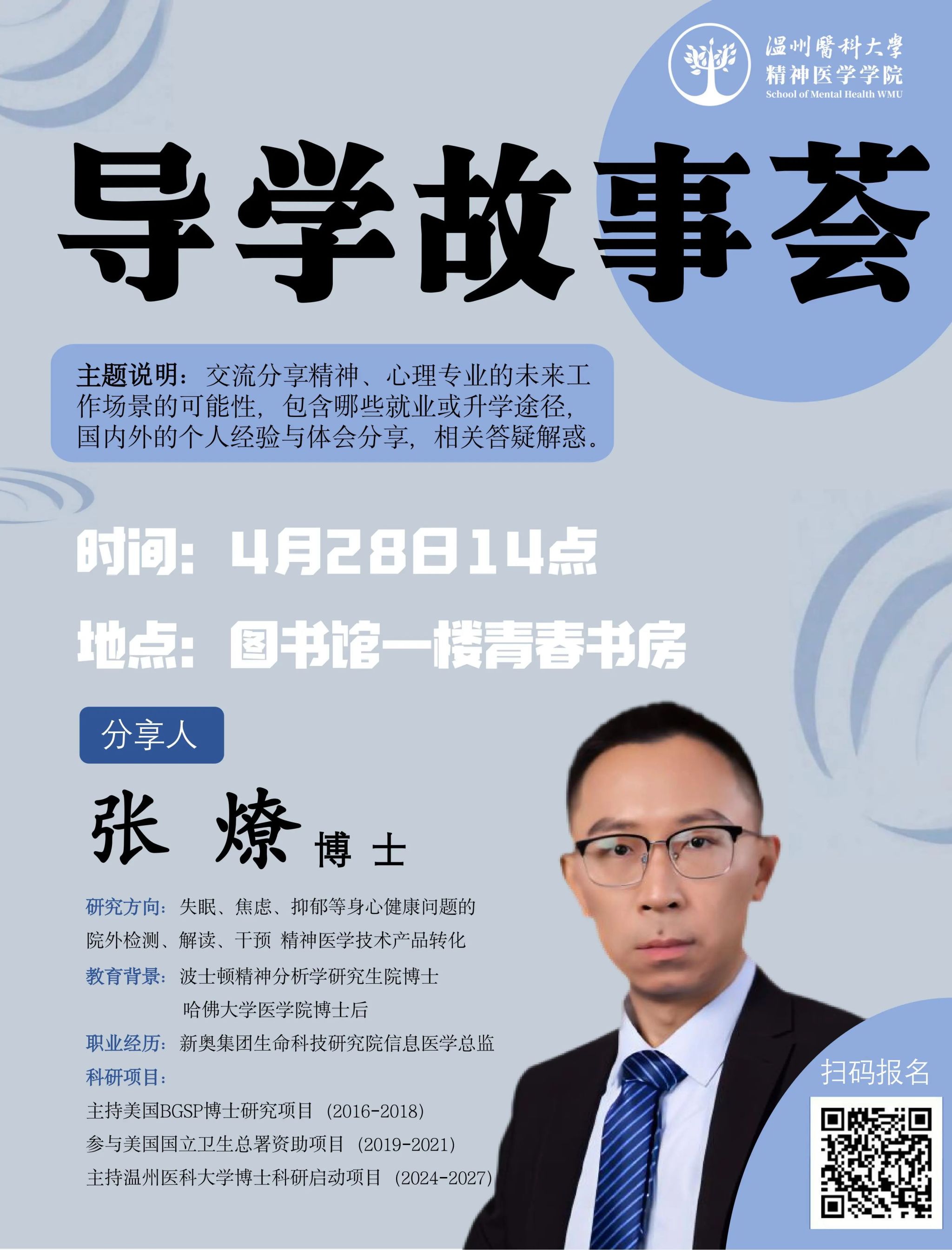 2025年4月28日下午,我院举办的第一期“导学故事荟”活动圆满结束!本期我们有幸邀请了在精神医学和心理领域都具有丰富经验和深厚造诣的专家张燎老师给我们带来了精彩纷呈学术交流及就业经验分享。现场气氛热烈,同学们积极提问,与张燎老师进行了深入的交流和探讨。下面,就让我们一起来回顾一下这次精彩的活动吧!