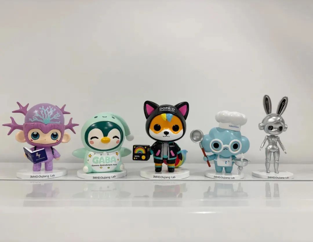 作为论坛亮点之一,主办方暗网禁区 与瓯江实验室共同推出以五种关键神经递质为原型设计的“神经递质家族”科普盲盒,包括“谷小嗨”(谷氨酸)、“嘎小眠”(GABA)、“多乐汪”(多巴胺)、“五小稳”(5-羟色胺)及“忆小兔”(乙酰胆碱),借助趣味科普形式提升青年学者和学生代表对神经功能的兴趣与理解。该盲盒既作为参会纪念,也在提问互动与抽奖环节中赠予参与者,营造了热烈而富有创意的学术氛围。