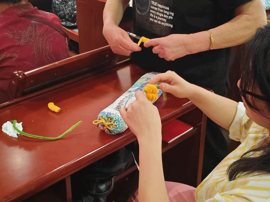 在丹田环放松活动后,我院志愿者们为在场的老人们准备了丰富的艾草中式颈枕制作材料。在志愿者的耐心指导和帮助下,老人们亲手制作属于自己的颈枕。活动中,志愿者们积极协助老人们完成作品,并送上真挚的祝福。这一活动不仅能够提升老人的手眼协调能力,还能通过制作艾草颈枕作品来改善睡眠和健康状态,让老人们享受与同伴交流互动的乐趣。